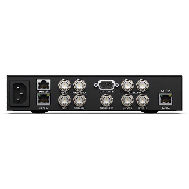 With 10G Ethernet on the Pro model, you can connect all signals to the camera with the one Ethernet IP link connection. That means the camera feed, return program feed, timecode, reference, tally, talkback and control are all sent down the single cable. That's the same benefits of SMPTE fibre, but the standard 10G copper Ethernet cable is much lower cost. The Blackmagic Studio Converter allows the breakout of all the video, audio and talkback connections at the studio end. It also includes a massive power supply that powers the camera down the Ethernet cable, so you don't need a power source near the camera. Plus you can fit 2 per rack unit using a Blackmagic Universal Rack Shelf.