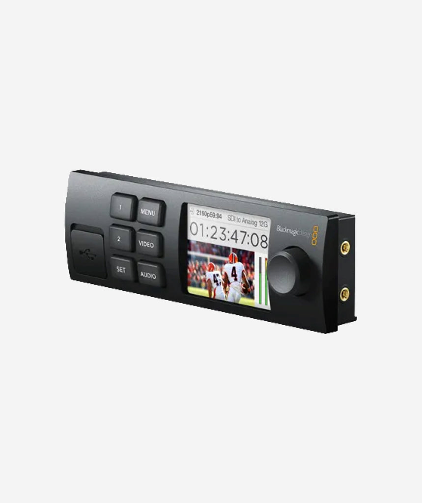The Teranex Mini Smart Panel, from Blackmagic Design, is designed to simply replace the existing front panel on any Teranex Mini Converter as well as the Blackmagic Web Presenter. It provides a 2.2" color LCD, a spin dial, and six control buttons, including a menu control. You'll be able to adjust settings, browse menus, monitor conversions in progress, monitor audio levels, verify timecode, and verify the video standard being converted.
